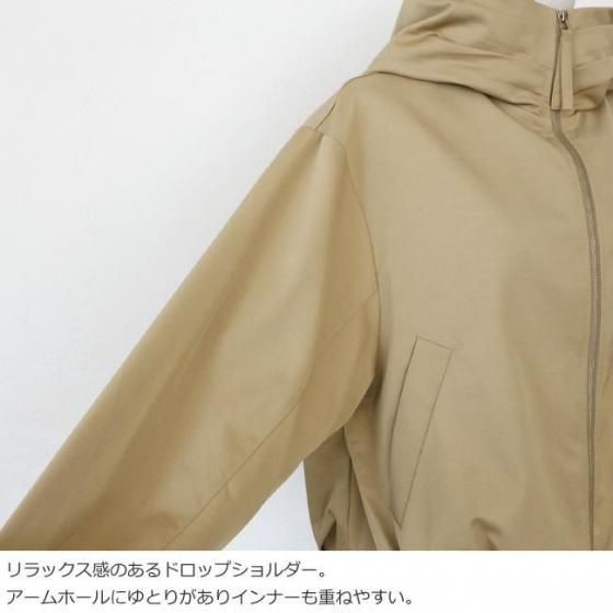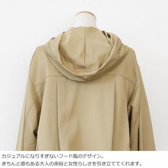 パーカー見えするフード風のハイネックデザインがカジュアルすぎないポイントです。