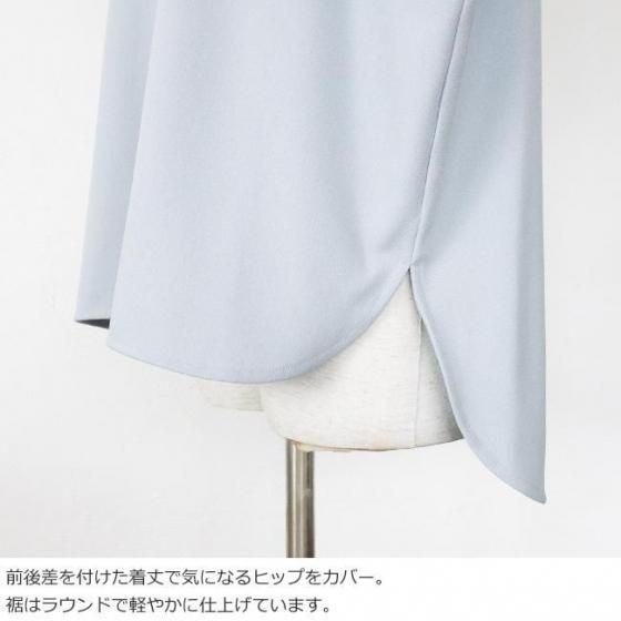 広めに開いたネックラインや前後差を付けた着丈がさり気ない抜け感を演出。