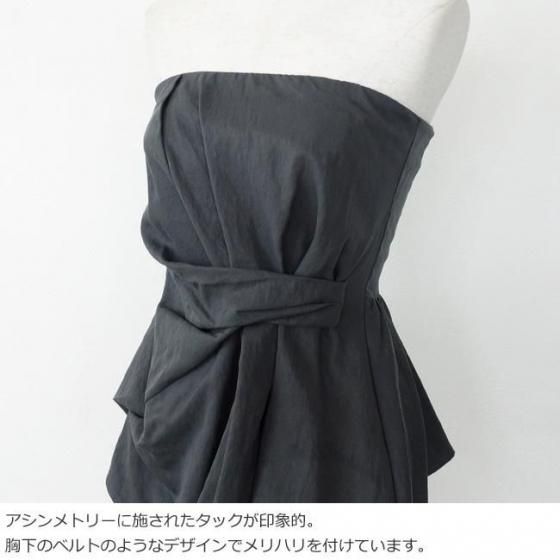 アシンメトリーに施されたタックやベルトのようなデザインが目を惹きます。