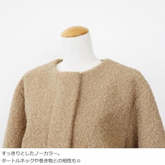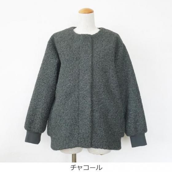 袖口と後ろ裾のリブ切り替えや、すっきりとしたノーカラーのデザインがポイント。