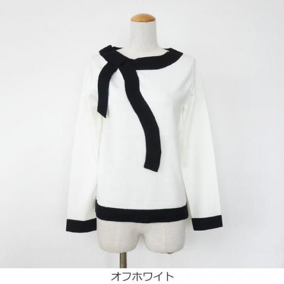 ボートネックラインに配色リボンを添え、華やかに仕上げています。
