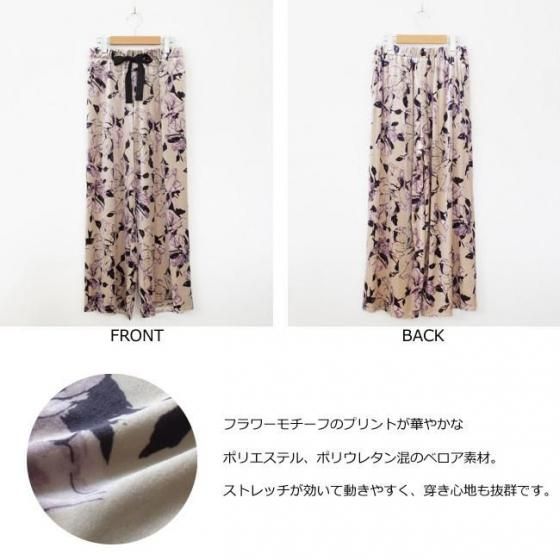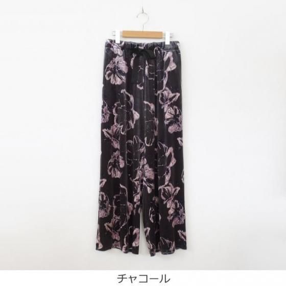 柔らかく上品な光沢のあるストレッチベロア素材を使用したパンツ。