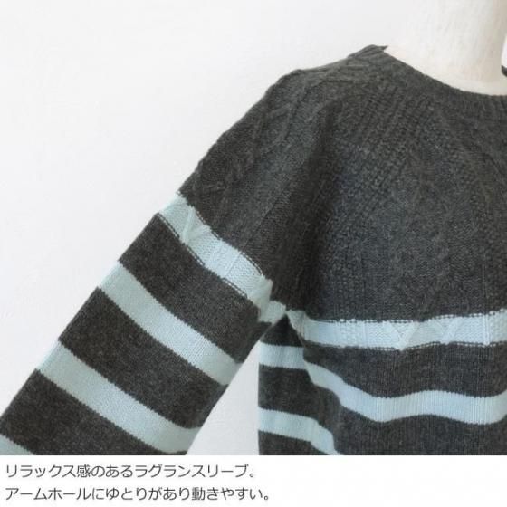 ボーダー柄と立体的なケーブル編みを組み合わせ、表情豊かに仕上げています。