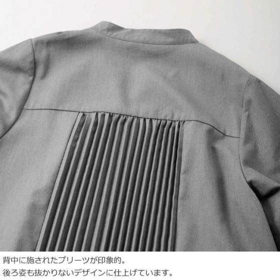 ラペルのようなカッティングを施した襟のデザインがきちんと感を演出します。