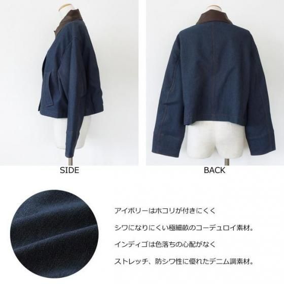アイボリーはポリエステルコーデュロイ、インディゴはデニム調のポリエステル素材を使用。